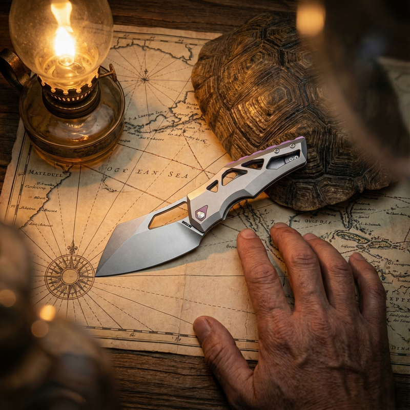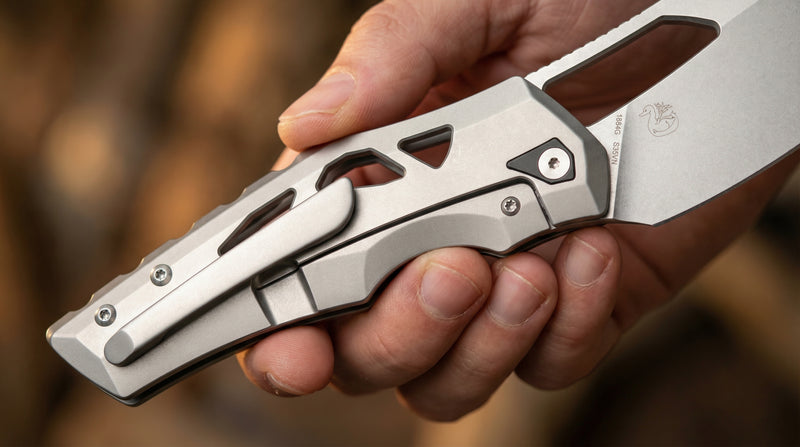 At Blade Show Texas, I found myself enamoured with some of the oversized knives around, especially the Titanium framelocks. That just put the idea in my head to try designing one for myself. Something big and beefy, but still maintaining the huge blade in a small handle design spin I like to give my knives. Once the overall profile was set, I thought it looked a bit like a turtle, thus the name: Tortoise.