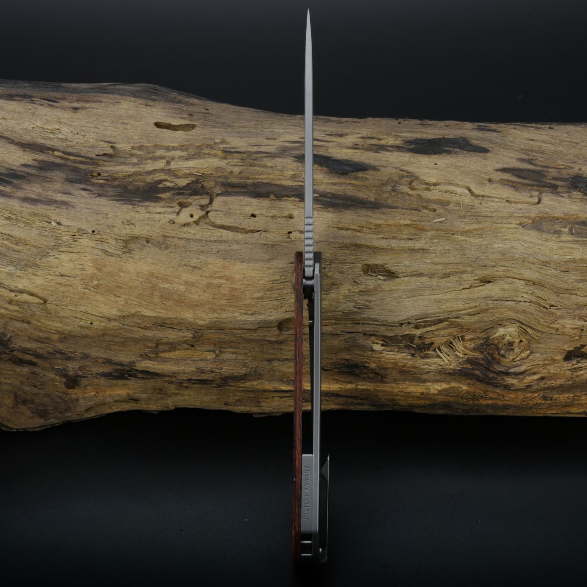 The Arion is a folding knife from Artisan Cutlery that has a surprisingly big bite. The spear point blade is wider than the width of the handles, leading to a pleasant surprise when the knife is opened. The blade is made from high-quality S35VN, a favorite for high-end knives, and is smoothly deployed on ball bearings with a thumb groove. The presenting handle scale is burgundy micarta, while the back is textured titanium, providing an attractive look without sacrificing grip or functionality. This knife is fun to use and is definitely one we would recommend. It comes with a titanium pocket clip and hidden lanyard hole for ease of carrying.