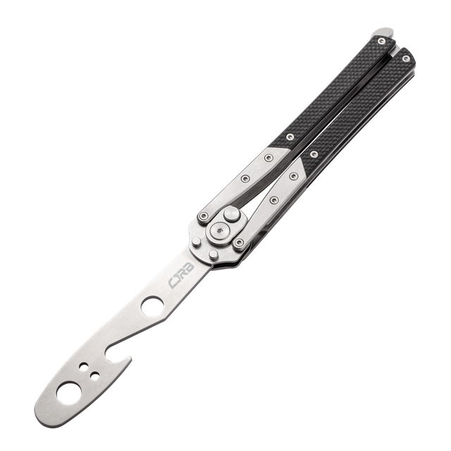 The Artisan Cutlery Kinetic-Variant Grey Stainless is a butterfly knife multi-tool with an automatic push-button mechanism. The dull trainer blade made from stonewashed 8CR stainless steel has a pry bar tip, bottle opener, hex wrench, and ruler. Includes a titanium latch for locking the handle when the blade is open or closed. The handles are made from skeletonized gunmetal grey stainless steel for reduced weight, and the flipping action is smooth as silk.