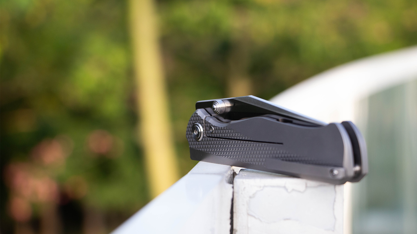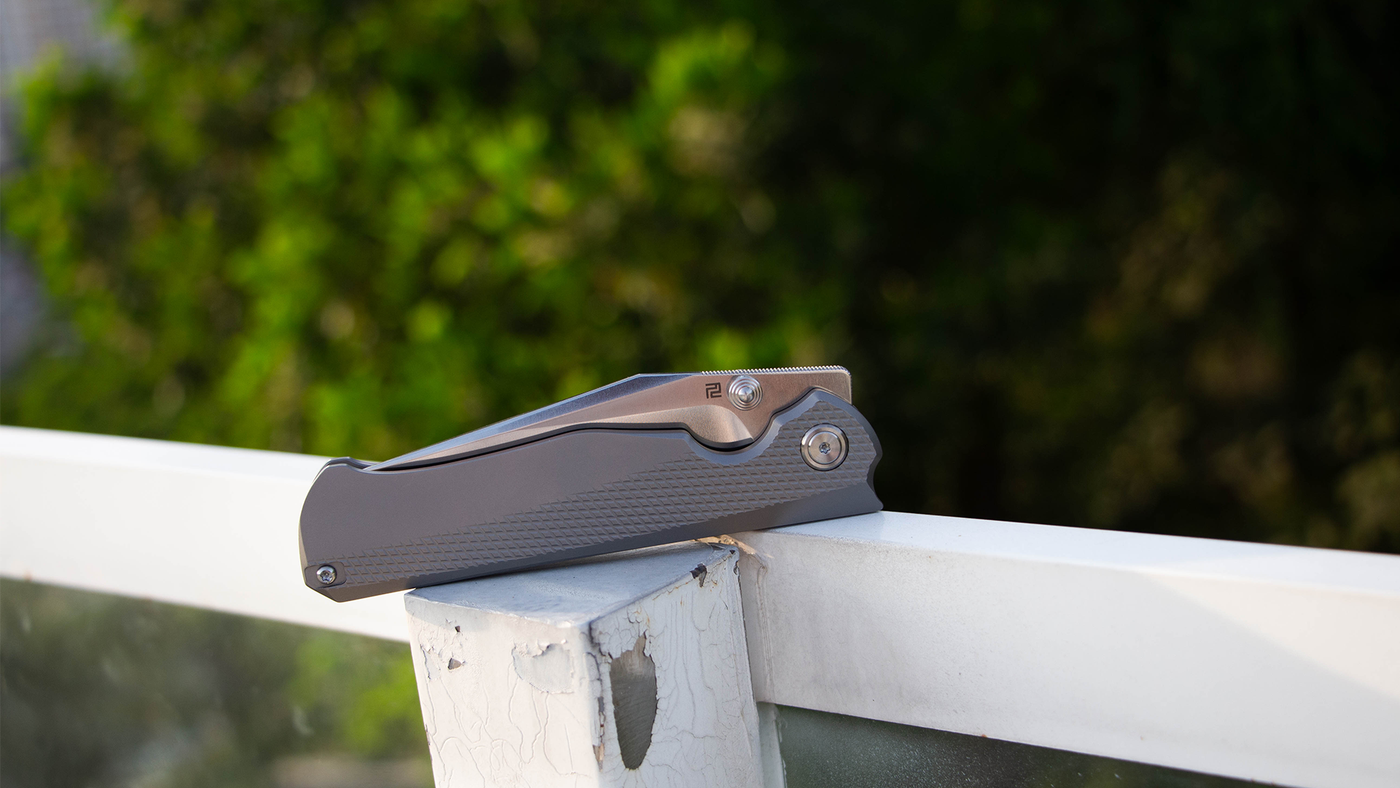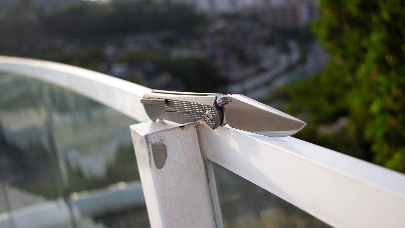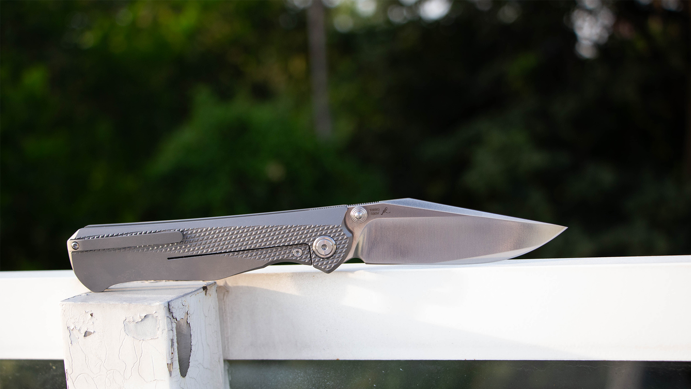 “As knife enthusiasts, one often pondered question is that of the desert island knife. If you were stranded on a deserted island and could only have one knife, what would it be? For this design, I tried to distill features that I love from different designs into one knife I could be happily stranded with, and that's the Crusoe. It is a full size knife, big enough to do some serious work, but sleek enough to forget about in pocket. It features a neutral handle profile with an index finger cutout and widened back end to provide just enough security but not get in the way when using different grip options. The handle spine is gently concave for maximum comfort in hard bearing tasks, and leads uninterrupted into the robust drop point blade. The low tip makes utility cuts easier to manage, while maintaining enough belly for slicing performance. Using thicker blade stock combined with a high flat grind and swedge, the blade is strong enough to put up with some measured abuse but precise enough to slide through material and perform detailed work. The construction is simplified to just a single barrel spacer through which the clip is attached, relying on the thicker yet gently tapered titanium handles for stability. The bearing action is smooth and addicting, with both opening hole and front flipper deployment options, and easily accessible lock bar disengagement. It's a do it all knife, a trusty companion, a worthy desert island pick. ”