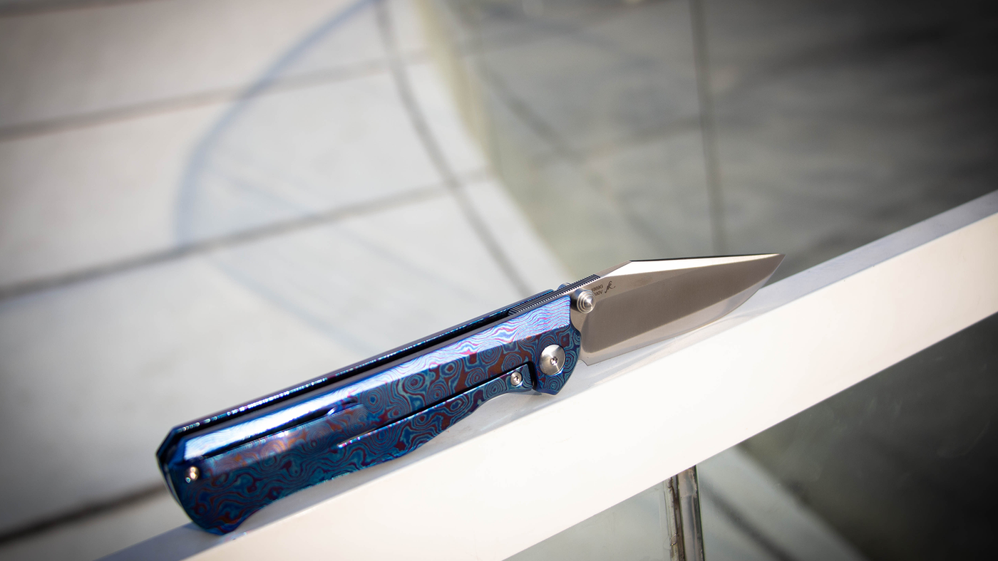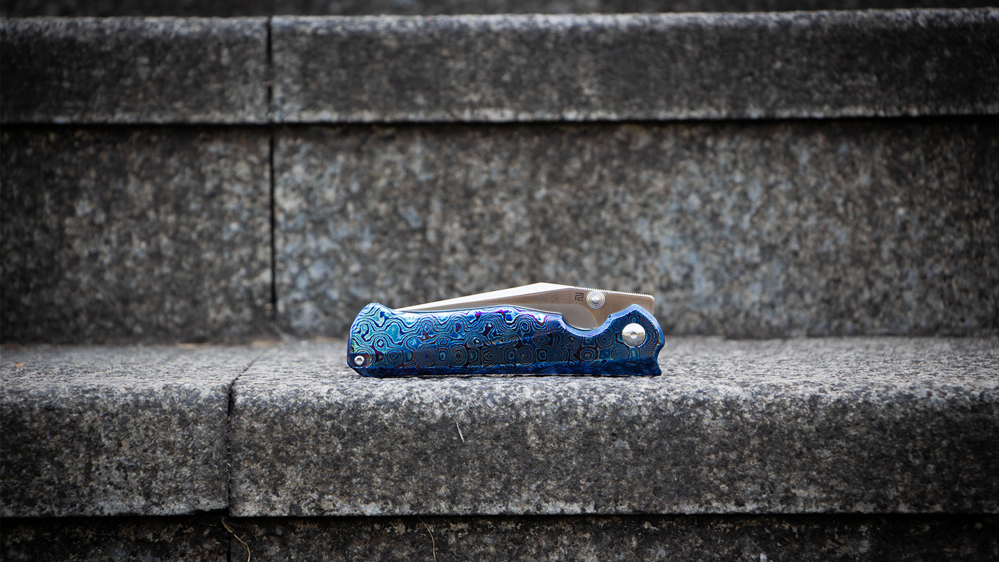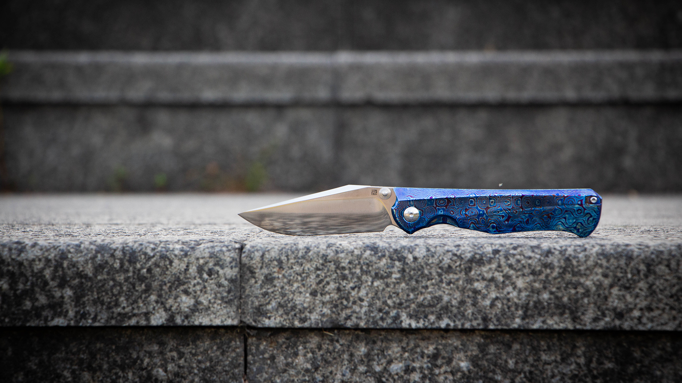 “As knife enthusiasts, one often pondered question is that of the desert island knife. If you were stranded on a deserted island and could only have one knife, what would it be? For this design, I tried to distill features that I love from different designs into one knife I could be happily stranded with, and that's the Crusoe. It is a full size knife, big enough to do some serious work, but sleek enough to forget about in pocket. It features a neutral handle profile with an index finger cutout and widened back end to provide just enough security but not get in the way when using different grip options. The handle spine is gently concave for maximum comfort in hard bearing tasks, and leads uninterrupted into the robust drop point blade. The low tip makes utility cuts easier to manage, while maintaining enough belly for slicing performance. Using thicker blade stock combined with a high flat grind and swedge, the blade is strong enough to put up with some measured abuse but precise enough to slide through material and perform detailed work. The construction is simplified to just a single barrel spacer through which the clip is attached, relying on the thicker yet gently tapered titanium handles for stability. The bearing action is smooth and addicting, with both opening hole and front flipper deployment options, and easily accessible lock bar disengagement. It's a do it all knife, a trusty companion, a worthy desert island pick. ”
